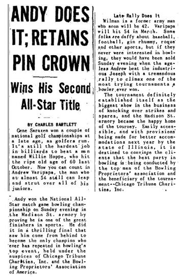 1940's Articles Andy Does It; Retains Pin Crown – December 16, 1947 August 7, 2016 avaripapa Leave a comment Click image to enlarge Share this: Click to share on X (Opens in new window) X Click to share on Facebook (Opens in new window) Facebook More Click to print (Opens in new window) Print Click to email a link to a friend (Opens in new window) Email Like Loading... Related