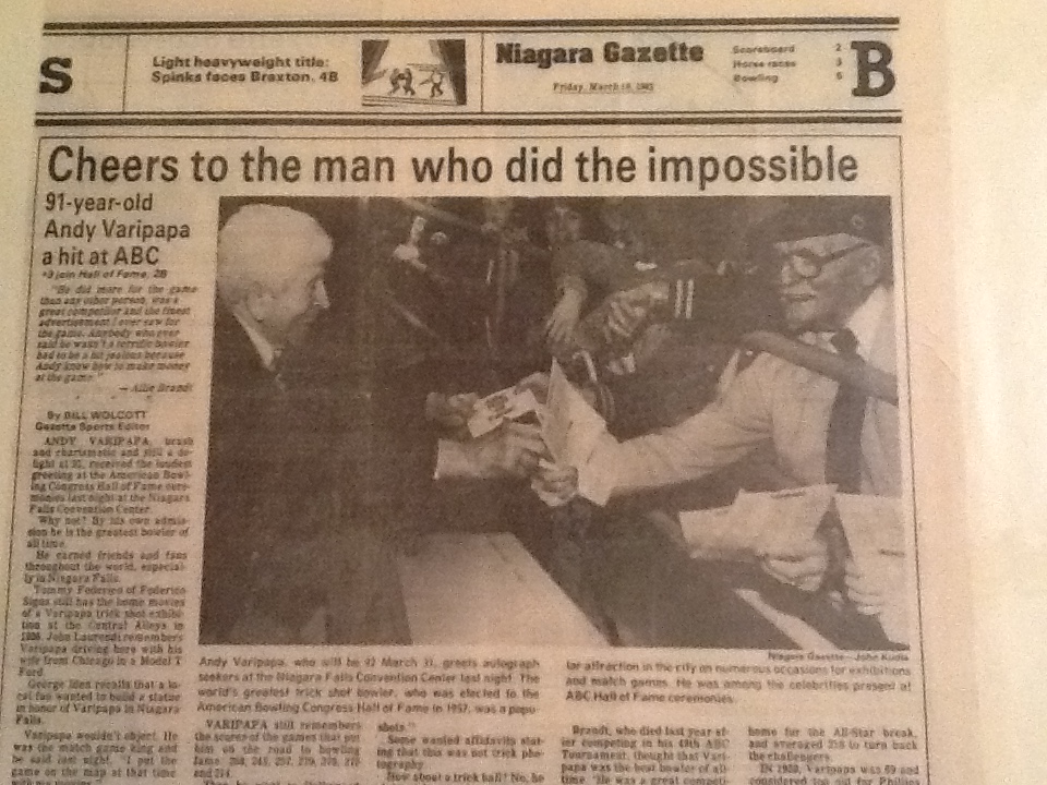 Andy Varipapa, who will be 92 March 31, greets autograph seekers at the Niagara Falls Convention Center last night. The world’s greatest trick shot bowler, who was elected to the American Bowling Congress Hall of Fame in 1957, was a popular attraction in the city on numerous occasions for exhibitions and match games. He was among the celebrities present at ABC Hall of Fame ceremonies.